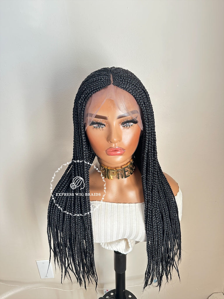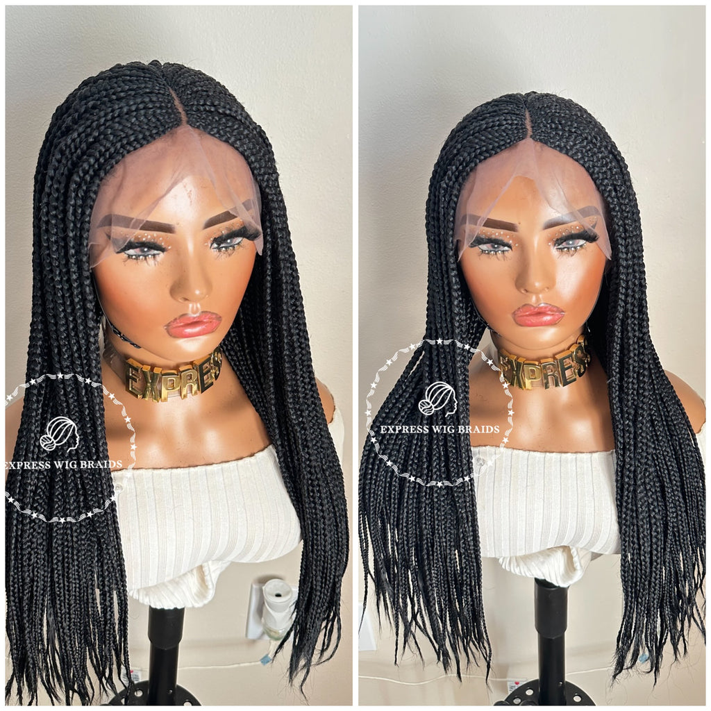 Wig displayed: 100% HD Full Lace Virgin Hair / Best Quality Lace Type: Handmade Style: Bohemian Cornrow Knotless Braids Length: 23-26 inches mid back length  Color: 1b  Density: full Baby hair: Sparse straight baby hair Thickness: medium braids Braid Extensions: synthetic braiding hair...